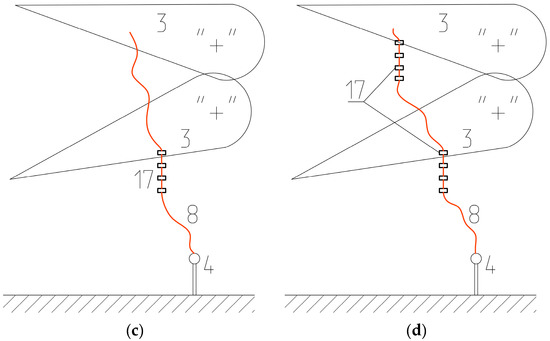 In the experiments, the upper and lower groups of model hydrometeors were formed from four conductive cylinders 3.5 cm long. The distance between the model hydrometeors in the group was 2.9 cm. Four series of experiments were performed, in which the number of positive polarity ATCs and the number of groups of model hydrometeors introduced into them varied. The variations in the arrangement of the model hydrometeors are shown in Figure 2. In the first series of experiments, one lower ATC and one group of model hydrometeors were used (Figure 2a). The group of model hydrometeors was located near the lower boundary of the cell. The second series of experiments used one lower ATC and two groups of model hydrometeors (Figure 2b). The upper group of model hydrometeors was located inside the ATC, and the second group was located near its lower boundary. The distance between the groups was ~25–30 cm. In the third series of experiments, two ATCs and one group of model hydrometeors were used (Figure 2c). The group of model hydrometeors was located near the lower boundary of the cell. The fourth series of experiments used two ATCs and two groups of model hydrometeors (Figure 2d). The upper group of model hydrometeors was located in the space between the cells, and the lower group was located near the lower boundary of the lower cell, partially within its boundary layer. The distance between the groups was ~40–50 cm.