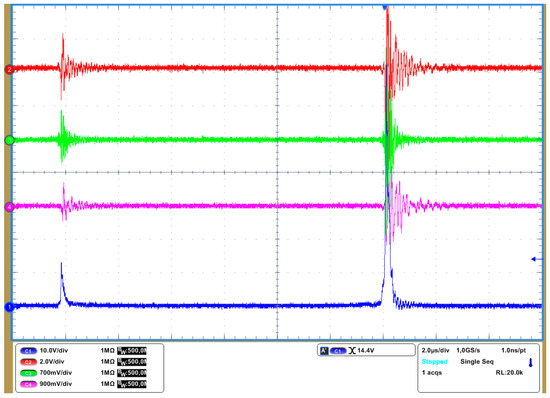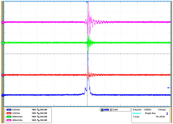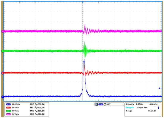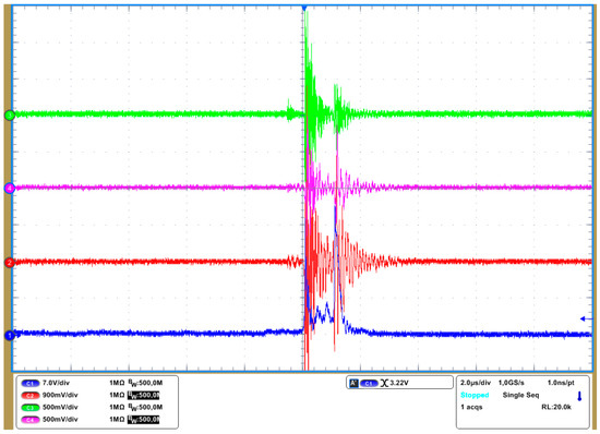 Characteristic oscillogram of the current pulse (blue signal) of the main discharge stage with participation of only the lower group of model hydrometeors and signals, registered by antennas A1–A3 (red, green and magenta signals resp.).