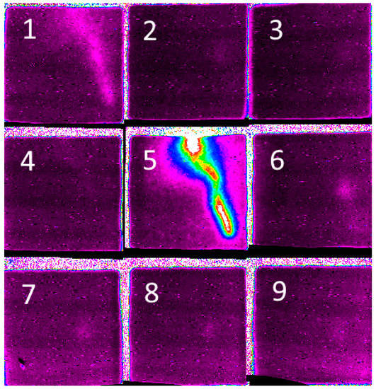 To register the discharge current (5), a rod electrode 0.25 m in height with the spherical top (radius 2.2 cm) (4) had been set on the grounded plane under the positively charged cells. The top was isolated from the main rod part to decrease the influence of displacement currents on the registered electric characteristics of the discharge. The currents of the first and repeated discharges between the positively charged ATCs and ground, and the electromagnetic signals induced by them on the antennas, simultaneously with their optical emission, were recorded with a Tektronix DPO7254 digital oscilloscope (Tektronix, Inc., Beaverton, OR, USA, analog bandwidth 2.5 GHz) (10) using low-inductive coaxial shunts (9) (resistance 0.5 Ohms). To register the electromagnetic radiation of the discharge phenomena, we used a system of broadband flat antennas (5–7) located: (1) on the ground surface directly near the place of formation of the first and repeated discharges (antenna A1), (2) at several meters from this place (antenna A3), and (3) at the height of the lower ATC (antenna A2).