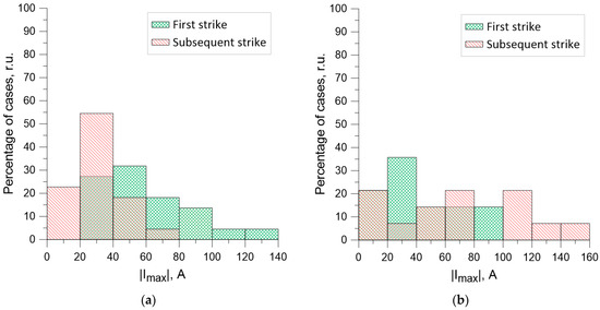 Distribution of current pulse amplitude values of the first and repeated discharges at negative polarity of artificial thunderstorm cells (a) and at positive polarity of artificial thunderstorm cells (b).