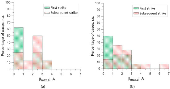 It should also be noted that such results differ from what was determined when physically simulating the first and repeated discharges from the negatively charged ATC system [39] (Figure 14a), and from observational data on negative natural lightning [40], where the amplitude of the current pulse of repeated strikes was on average much lower than the amplitude of the first strike current. It can also be assumed that the ratio of the amplitudes of the first and repeated current pulses in multistrike positive lightning depends on the region and season, where and when such lightning was formed, and the specific conditions of the size, number and location of positive charge areas in the thundercloud and hail massifs in it that can take shape [13,14].