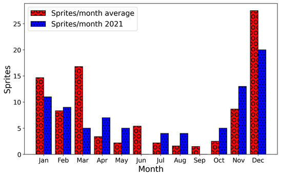 Distribution of the monthly number of sprites observed by ASCA. The red bars show the monthly averaged number of observed sprites from September 2016 to February 2022, and the blue bars show the monthly number of observed sprites in 2021.