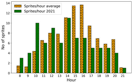 Distribution of the hourly number of sprites observed by ASCA. The yellow bars show the hourly averaged number of observed sprites from September 2016 to February 2022, and the green bars show the hourly number of observed sprites in 2021. 8:00 and 21:00 UTC correspond to 17:00 and 6:00 JST.