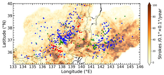 - Sugita, A.; Matsui, M. Lightning characteristics in Japan observed by the JLDN from 2001 to 2010. In Proceedings of the 22nd International Lightning Detection Conference, Broomfield, CO, USA, 2–5 April 2012; pp. 2–3. [Google Scholar]