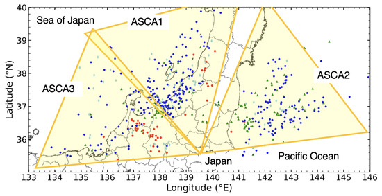 Field of view of the three ASCA cameras. Spring, summer, autumn, and winter are represented by green triangles, red dots, light blue diamonds, and blue dots, respectively.
