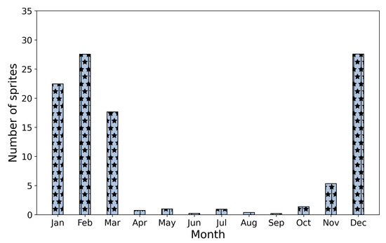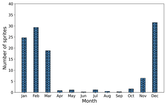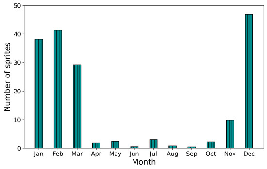 Estimated monthly distribution of sprites in case A (see caption of Table 1 for an explanation of the three different cases).
