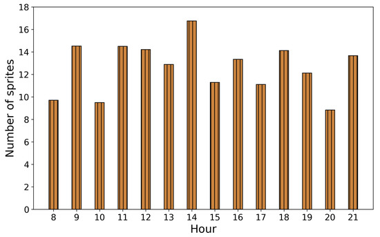We use the International Reference Ionosphere (IRI) model https://ccmc.gsfc.nasa.gov/modelweb/models/iri2016_vitmo.php (accessed on 1 September 2022) [30] to study the seasonal and daily difference in . Given parameters such as date, latitude, and longitude, the IRI calculates in the ionosphere at a specific time and location. We set the height at 80 km—the same as the top height of sprites. As many sprites are detected around Wajima on the Sea of Japan side, the specified latitude and longitude are the location of the Wajima Meteorological Observatory ( N, E). We also use the observation data at C isotherm height from the Wajima Meteorological Observatory. Figure 7 shows the monthly average of during 2015 and 2020 at the time of 16:00 UTC. varies in different months, and is affected by seasonal changes. For instance, in July is 12 times higher than in January. Figure 8 shows the hourly average of in 2020 during the time between 8:00 and 21:00 UTC. The hourly distribution of is inversely correlated with the monthly distribution. For instance, at 8:00 UTC is 157 times higher than that at 16:00 UTC. Therefore, using this result, we can consider the change in to be caused by solar radiation.