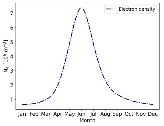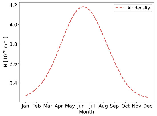 Next, we use the Naval Research Laboratory Mass Spectrometer and Incoherent Scatter Radar Exosphere model (NRLMSISE-00) https://ccmc.gsfc.nasa.gov/modelweb/models/nrlmsise00.php (accessed on 1 September 2022) to investigate the monthly variation of N [31]. NRLMSISE-00 is a global standard atmospheric model based on Earth observations, modeling the temperature and number density of atmospheric components from the ground to space (∼1000 km). As the hourly variation of N is not apparent, we only consider the monthly variation of N, as shown in Figure 9.