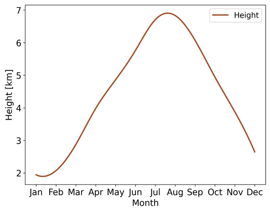 According to Takahashi [32], Takahashi [33], charge separation in thunderclouds occurs actively at around C isotherm height. As the C isotherm height is similar to [34], can be estimated by examining the C isotherm height [35]. Using the meteorological data released by the Wajima Meteorological Observatory, we investigate the C isotherm height, and Figure 10 shows the monthly distribution of C isotherm height. Thunderclouds bring lightning strokes, accompanied by intense convection. In Japan, where seasonal winds prevail, thunderclouds occur both in summer and winter. The surface temperature from June to September is around 30 C. Due to surface heating, the C isotherm height exceeds 5.7 km. On the other hand, winter thunderclouds are formed when cold air from Siberia collides with water vapor produced by the Tsushima warm current. Therefore, the C isotherm height is approximately 2 km, as the sea surface or ground temperature is not as hot as in summer.