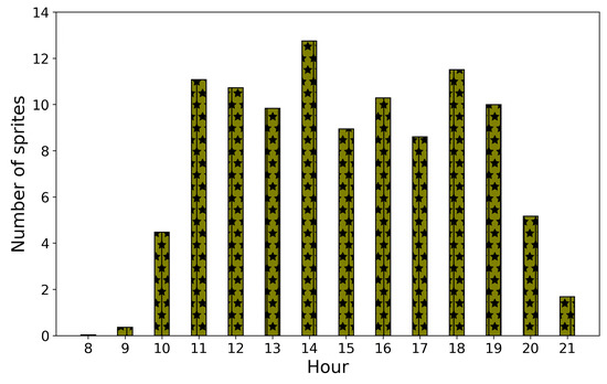 Estimated hourly distribution of sprites in case A (see caption of Table 1 for an explanation of the three different cases).