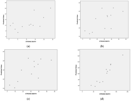 The scatter plots display the relation of predicted values by observed stroke deaths for: (a) 1985; (b) 1986; (c) 1987; (d) 1988; (e) 1989; (f) whole quinquennium.