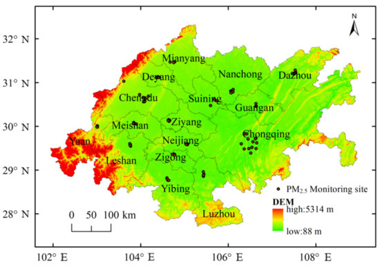 PM2.5 monitoring data were obtained from the hourly value and the 24 h average value of PM2.5 concentration of monitoring stations in Economic Circle in 2018 and downloaded from China Environmental Monitoring Center (http://www.cnemc.cn/) (accessed on 10 December 2021). The monthly average concentration of PM2.5 was obtained by adding and averaging the average daily concentrations. There are 88 environmental monitoring stations in Chengdu–Chongqing Economic Circle. After screening, 76 environmental monitoring stations with 912 (12 × 76) groups of valid data were obtained.