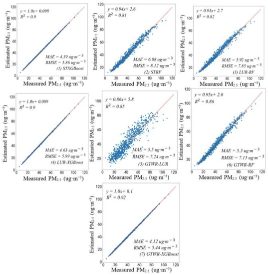 To compare the model accuracy, on the premise of ensuring the same independent variables, this paper constructed the fitting scatter plot of the corresponding PM2.5 predicted concentration and ground monitored concentration, as shown in Figure 3 below. Figure 3 shows the scatter density maps fitted between the PM2.5 concentrations estimated by STXGBoost, STRF, LUR-RF, LUR-XGBoost, GTWR-LUR, GTWR-RF, and GTWR-XGBoost models and the PM2.5 concentrations measured at ground monitoring stations. It can be seen from Figure 3 that the GTWR-XGBoost model is superior to STXGBoost and STRF models, and the cross-validation R2, RMSE, and MAE were 0.92, 5.44 ug·m−3, and 4.12 ug·m−3, respectively. Firstly, the GTWR model can better learn the spatiotemporal correlation of PM2.5 monitoring site data to describe the spatiotemporal characteristics and then combine the factors of human activity intensity to express the complex nonlinear relationship of PM2.5 concentration, which improves the accuracy of PM2.5 estimation. The second is the accuracy of LUR-XGBoost model. By screening variables of various influencing factors of PM2.5 through LUR, the factors with low influence can be effectively excluded. At the same time, the spatial correlation of site data can be obtained by combining Kring interpolation method to retrieve PM2.5, which can obtain better accuracy. The STRF model had the worst effect on the estimation of ground PM2.5 concentration. The cross-validation R2, RMSE and MAE were 0.81, 8.12 ug·m−3 and 6.08 ug·m−3, respectively.