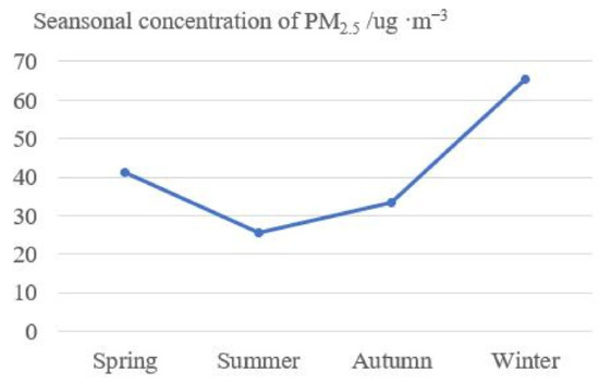 The temporal variation of PM2.5 concentration includes daily, monthly, quarterly and inter-annual variations. The time scales studied in this paper are month, season, and year. From the perspective of monthly variation, taking 2018 as an example, the variation of monthly average PM2.5 concentration in the area generally decreased first and then increased, showing a V-shaped pattern. In January and February, the pollution was the most serious, with an average value of 69.90 ug·m−3 and 69.88 ug ·m−3, respectively. Secondly, in March, November and December the average value exceeded 40 ug·m−3. The average value was 20.28 ug·m−3 in September. PM2.5 decreased from 69.90 ug·m−3 in January to 21.12 ug ·m-3 in July. Increased from 20.28 ug·m−3 in September to 56.38 ug·m−3 in December. The seasonal variation of PM2.5 in the region is obvious. Statistics show that the average values of spring (3, 4, 5), summer (6, 7, 8), autumn (9, 10, 11), and winter (12, 1, 2) in this region are 41.19 ug ·m−3, 25.58 ug·m−3, 33.40 ug·m−3, 65.34 ug·m−3, respectively (as shown in Figure 4), in which the values of winter and spring is 1.8 times that of summer and autumn. The seasonal variation of PM2.5 concentration was roughly consistent with the monthly trend, with winter > spring > autumn > summer.