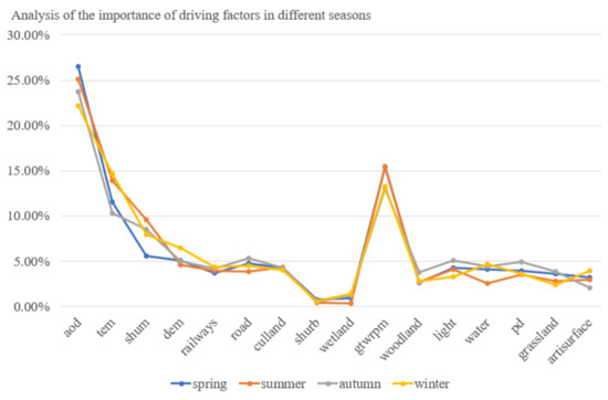 According to the analysis of the importance of driving factors in different seasons (as shown in Figure 7), the proportions of AOD, GTWRPM_2.5, TEM, and SHUM to PM2.5 concentration was about 23%, 17%, 14%, and 12%, respectively, and their importance decreased successively, indicating that meteorological factors have a greater impact on the retrieval of PM2.5, with a contribution rate of 66%. All the selected human activity intensity factors contribute 34% to the retrieval of PM2.5 concentration, among which the cultivated land (culland), road, railway, Artificial surface (artisurface), population density (PD), and night light (NL) had moderate impacts on PM2.5, contribute 20% to the retrieval of PM2.5 concentration, the forest land, grassland, wetland, shrub, and water contribution the inversion of PM2.5 concentration is the lowest.