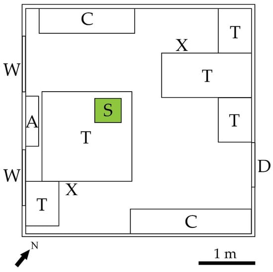 Representative model of the study room. S = sampler, T = table, C = closet, D = door, W = window, A = air conditioner, X = positions usually occupied by workers. The arrow in the bottom left indicates the north.