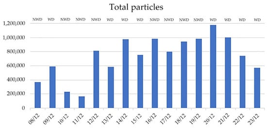 As shown in Table 1, in the 16 days of monitoring, a total of 11,698,648 particles were sampled, 1,937,790 of which were fluorescent, amounting 16.56% of the total number. The day with the lowest number of particles (Table 1) was 11 December 2021, an NWD, with 166,621 total particles, and 26,213 fluorescent particles. The day with the highest number of particles was 20 December 2021, with 1,003,323 total particles, and the day with the highest number of fluorescent particles (198,500) was 18 December 2021, an NWD. Moreover, WDs have a higher mean number of both total particles (799,906 vs. 662,425 per day) and fluorescent particles (131,807 vs. 110,417 per day).