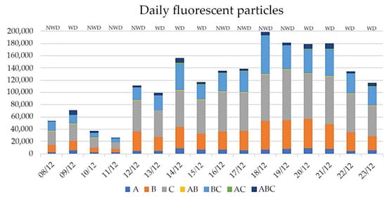 Considering the daily trend of particle number (Figure 2 and Figure 3), the total number of particles was relatively low in the first 4 days of sampling, with an average number of 339,287, less than half the overall mean of 731,165. A sudden increase can be seen starting from 12 December 2021, more marked in the total count and less in the fluorescent particles, with a gradual decrease in the last 3 days of sampling in both graphs. Focusing on the fluorescent particles (Figure 3), a sequence of 4 days that have an average number of 184,692 can be noticed, notably higher than the total average of fluorescent particles (121,111).