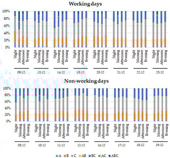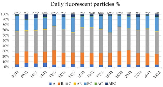 In most days, both WDs and NWDs, the highest number of fluorescent particles was found in the Evening (Figure 5), but with a clear percentage decrease of some channels, namely ABC (Figure 6).