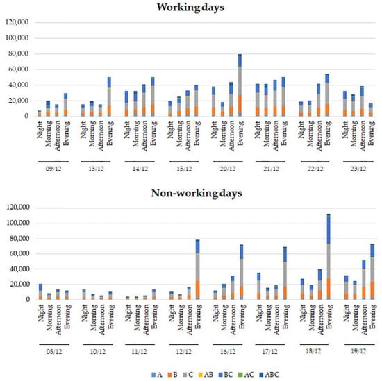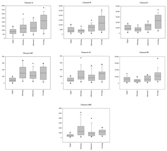 There is always a significant difference between working and non-working mornings when considering the median of all channels, except for AB (Table 3). Considering the 6-h partitions, there is a significant difference between WDs and NWDs when considering the morning, except in the case of the C channel. The difference between WDs and NWDs Afternoons is significant for only the ABC channel, while for evening and night there is never a significant difference.