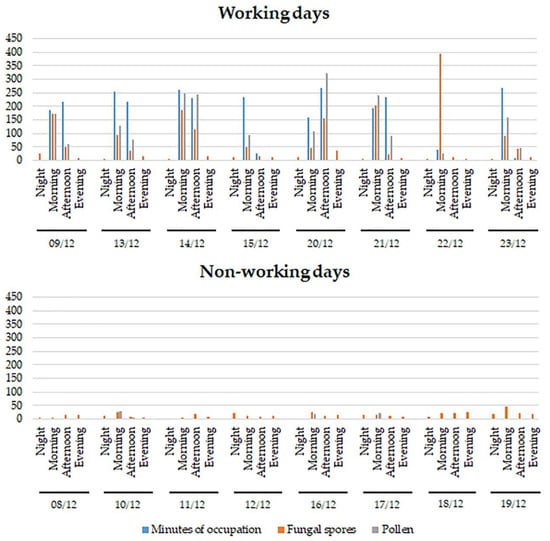 A remarkable result is the clear correlation between the minutes of occupation of the room by workers and the concentration of fluorescent particles identified as pollen and spores (Figure 9). This strongly suggests an influence of the workers in causing the increment of the concentration of such particles in the room, an increment that could be caused by passive transport or by the activities of the occupants, such as opening doors and windows, or turning on the heating of the room. None of these factors is probably enough to explain the bioaerosol levels by itself though, at least in this peculiar study case, as for example the opening of windows was very limited and occurred when bioaerosol levels were already found to be increasing.