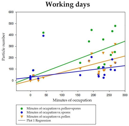 Regression analysis (R2 = 0.741) between minutes of occupation of the room and, respectively, pollen + spores (p < 0.001), spores (p < 0.001) and pollen (highly collinear). Degrees of freedom = 31.