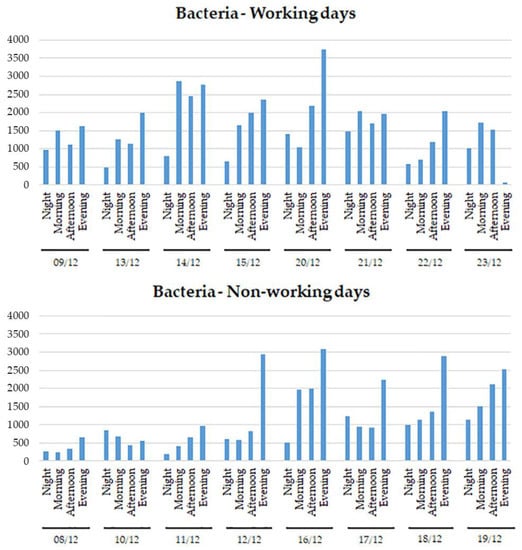 Number of bacteria-related particles (y-axis) for each day and each part of the day (x-axis). Working (WDs) and non-working days (NWDs) are shown separately.