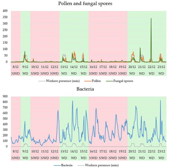 The 1-h distribution of particles (Figure 11) shows in finer detail the changes of particle levels in the air. Typically, the increment of pollen and fungal spores in the room during WDs starts between 7:00 and 9:00 in the morning, which is the time frame in which the workers entered the room in most of the considered days, and it fades after 12:00, in the hours we identified as afternoon. This is in line with the results obtained, considering the 6-h ranges. In NWDs the levels of pollen and fungal spores are always very low. Regarding bacteria, several peaks are present, but they do not differentiate between WDs and NWDs, and between WHs and NWHs.