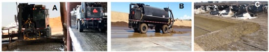 Scraped manure management can have lower methane emissions than flushing systems, and manure can be processed into more solid forms of manure through solar drying on open pads or unpaved yards, or in closed drying houses, forced evaporation using natural gas fueled dryers, or by composting []. Manure can be collected using vacuum trucks, automated mechanical scrapers, and front-loader or tractor-mounted rubber scrapers. The available manure vacuum trucks on the market are fully integrated vacuum trucks or vacuum tanks that can be towed behind a tractor. Figure 1A shows a vacuum truck collecting manure from a barn. Automated mechanical scrapers are composed of blades that remove manure into a collection location (Figure 1C). The blades are operated on a pulley system integrated with a cable or chain and an electric motor []. Although these systems can divert manure from the lagoon and reduce the emissions from lagoons, other emissions from the barns may be higher than the flushing systems. Results of Ross et al. [] showed that the NH3 emissions from barns using scraping were greater than using flushing. This was due to the fact that scraping may leave a film of manure that could be a source of NH3 emissions due to the degradation of organic nitrogen. The manure collected from scraping in California could be distributed on land or concrete slabs for sun drying for at least 8 months when there is positive evaporation []. There is little information on the emissions of methane from barns after collecting manure using vacuum trucks. In addition to flushing and scraping of manure from barns, solid manure on corrals is also scraped and used as a fertilizer. Niles et al. [] mentioned that unlike the farms using solid manure systems, farms with liquid manure systems have a limited number of technology options to manage their manure. This is reflected by the greater investments of some of the technologies needed to manage liquid manure, and the difficulties in changing them.