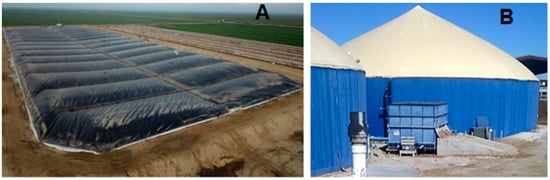 Common digester types on dairies: (A) covered lagoon [], and (B) above-ground CSTR digester.
