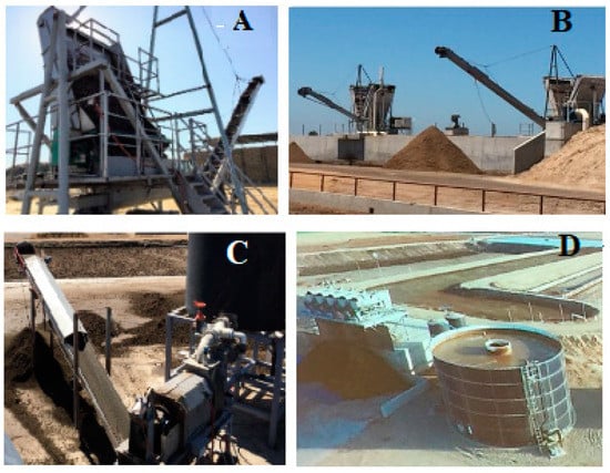 Mechanical separators are a common system used to remove manure solids prior to storage in lagoons. They include stationary screens, rotary drums, and screw presses. Manure solids are separated by passing manure, mainly flushed manure, over flat screens or through rotary drum screens with different opening sizes. Solids with particle sizes larger than the screen holes are separated while the liquid fraction passes through the holes. Screw presses operate by pressure that arises from squeezing manure between a screen and a screw conveyer along the press length. The liquid fraction passes through screen holes and solids are collected separately, usually at the end of the screw conveyor. The operational concepts and performance of different technologies used for solids separation from manure were reviewed by Zhang and Westerman []. Figure 3 shows selected mechanical separators that are currently employed in Californian dairies.