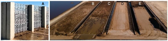 Generally, weeping wall systems consist of multiple cells, usually 2–4. Each cell is a standalone structure with concrete floors. Three sides of the cell are constructed using slotted concrete, horizontal wooden slats, or screens supported by concrete pillars [,]. The fourth side is used as an entry ramp for filling and emptying the cell. While the liquid manure travels along the cell, the solids accumulate inside the cell and the liquid is drained out of it. The drained liquid is usually stored in lagoons until it is used for irrigation. The accumulated solids in the cell act as a filter that aids in the capture of additional solids.