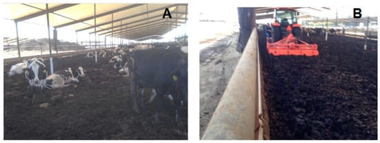 Compost-bedded pack barns are a housing system for dairy cows that have been recently introduced to California (Figure 5A). Barberg et al. [] described compost dairy barns in Minnesota and barn management practices employed. The barns can increase cows’ comfort by providing cows with an open bedded pack area for resting and exercise. Bedding materials are usually needed and mixed with excreted manure and urine. The best bedding materials for the compost-bedded pack barns should have good physical structure, good water absorption capacity, less than 25% initial moisture, and less than 2.5 cm long []. Shane et al. [] described different bedding materials used in compost-bedded pack barns including pine sawdust, corn cobs, pine woodchip fines, and soybean straw. Each of these materials can be used individually or mixed with other materials. The authors found that sawdust was the preferred choice of material to use as bedding in compost barns. It was concluded that with proper bedding management, any of the tested materials as bedding materials would work in compost-bedded pack barns. In California, straw, dried manure, or nut shells are usually employed.