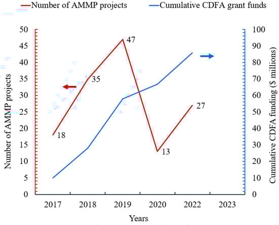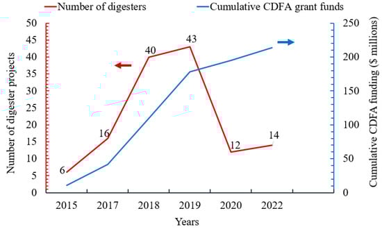 The Dairy Digester Research and Development Program (DDRDP) was established in 2015. The program awards competitive grants that partially fund anaerobic digesters in Californian dairies to minimize the emissions of CH4 from manure management and reduce its negative environmental impacts []. Figure 6 shows the number of digester projects and the funding from 2015–2020. From 2105 through 2022, 131 dairy digesters were funded with a total of $213.7 million and are expected to reduce 22,955,633 MTCO2e over 10 years, or 2,295,563 MTCO2e per year for at least 10 years, which is the expected minimum life of a DDRDP project. According to CDFA [], by the end of 2022, the application of DDRDP and AMMP accounted for 2.55 MMTCO2e that represents approximately 28% of the 9.0 MMTCO2e that needs to be reduced by 2030. Aggregating the emissions reductions expected from all 233 state-funded projects yields an estimated 25,557,283 MTCO2e for at least 5 years, or 2,555,728 MTCO2e per year for at least 5 years, which is the expected minimum life of an AMMP project.