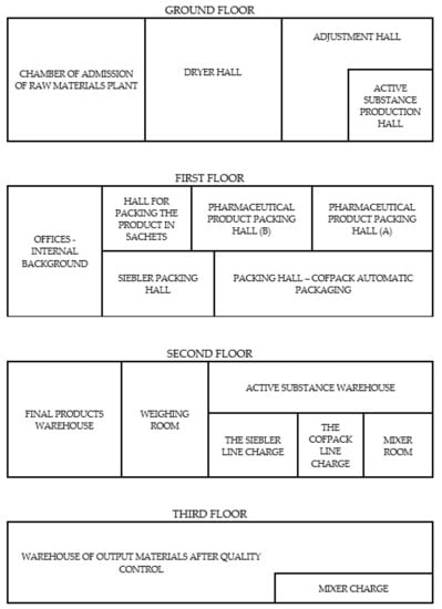 The study was carried out on the premises of a herbal processing plant in Poland. The selected herbal processing plant produces food and medicinal products based on herbs. Production is based on the Good Manufacturing Practice (GMP) and Good Hygienic Practice (GHP) systems as well as current legal regulations and international standards (ISO 9001, ISO 22000, ISO 22176) for medicinal products, food products, and cosmetics [13,14,15]. The study object was a 3-storey production building. In the plant, 17 measuring points were selected, located along the plant’s technological line, starting from the admission chamber for raw plant materials and ending with the final product warehouse. Bioaerosol samples were also collected at a point designated outside the plant for the determination of the “external background” and inside the plant, in a room separate from the production rooms for the determination of the “internal background” (a total of 19 measuring points). The following codes were assigned to the measuring points: 1—hall for packing the product in sachets; 2—external background; 3—mixer charge; 4—active substance warehouse; 5—pharmaceutical product packing hall (A); 6—adjustment hall; 7—dryer hall; 8—Siebler packing hall; 9—pharmaceutical product packing hall (B); 10—packing hall—Cofpack automatic packaging; 11—offices—internal background; 12—chamber of admission of raw materials plant; 13—active substance production hall; 14—warehouse of output materials after quality control; 15—final products warehouse; 16—mixer room; 17—the Cofpack line charge; 18—the Siebler line charge; 19—weighing room. A detailed scheme of a herbal plant is presented in Figure 1.