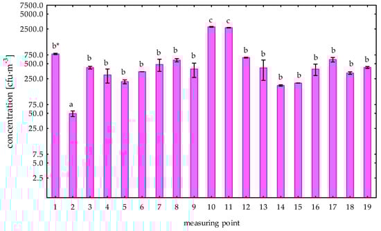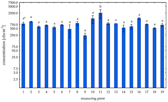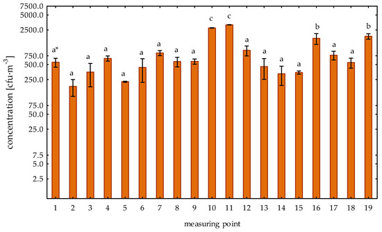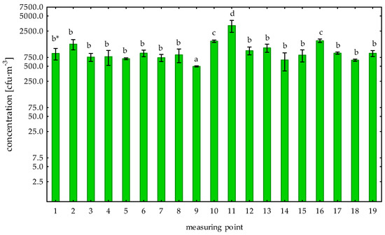 The concentration of the total number of bacteria in the autumn season (Table 1, Figure 4) in the examined plant ranged from 134 cfu·m−3 to 3189 cfu·m−3. The lowest average concentration of bacteria in the autumn was recorded at point no. 5 (226 cfu·m−3), and the highest at point no. 10 (3163 cfu·m−3) and it was significantly higher compared to the bacterial aerosol concentrations observed at other measuring points (Tukey’s test: p < 0.05). Taking into account the external and internal background, the lowest concentration of bacteria was noticed at point no. 2 (182 cfu·m−3), and significantly higher at point no. 11 (3163 cfu·m−3). Statistically significant differences were found in the concentration of the bacterial aerosol between point no. 16 and 19, and other measuring points (Tukey’s test: p < 0.05). An analysis of the concentration of bacterial aerosol in the production rooms and the outdoor air showed no significant differences (Scheffe’s test: p > 0.05). However, the analysis showed a significantly higher concentration of the total number of bacteria in the internal background compared to the external background (Tukey’s test: p < 0.05).