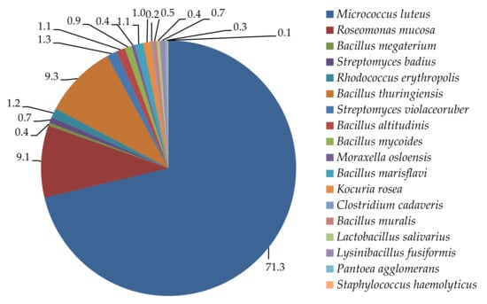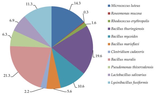 The results of the qualitative analysis of microorganisms isolated from the indoor and outdoor air are presented in Figure 6 and Figure 7. In the indoor air, 16 species of bacteria from 10 genera were identified. In terms of species, the most numerous were bacteria of the genera Micrococcus, Bacillus, and Roseomonas. In the outdoor air, 11 species of bacteria from seven genera were identified. In this case, the most numerous were bacteria of the Micrococcus and Bacillus genera.