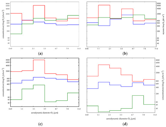 The particle distributions of bacterial aerosol in three groups of measuring points in the spring, summer, autumn, and winter seasons are presented in Figure 8a–d. The analysis of the size distributions of bacterial particles present in the air of production rooms in the spring season indicates the presence of these microorganisms mainly in the form of single cells (with aerodynamic diameters of 1.1–2.1 µm). In the summer and autumn seasons, these microorganisms were present in the production rooms in the form of small bacterial or bacterial–dust aggregates, and in winter—in the form of single cells and small bacterial or bacterial–dust aggregates. The described size distributions and the actual size of bacteria from the group of Gram-positive cocci (with aerodynamic diameters in the range of 1.1–2.1 μm) present in the indoor air may indicate additional emission of these bacteria in the spring and winter seasons from their main source, which is the human body.