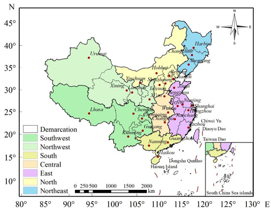 Mainland China was taken as the study area, which includes 31 provinces (autonomous regions and municipalities directly under the central government). It is divided into seven geographical regions: Northeast China (Liaoning, Jilin, and Heilongjiang), North China (Beijing, Tianjin, Hebei, Shanxi, and Inner Mongolia), East China (Shanghai, Jiangsu, Zhejiang, Anhui, Fujian, Jiangxi, and Shandong), Central China (Henan, Hubei, and Hunan), South China (Guangdong, Guangxi, and Hainan), Northwest China (Shaanxi, Gansu, Qinghai, Ningxia, and Xinjiang), and Southwest China (Chongqing, Sichuan, Guizhou, Yunnan, and Tibet). Owing to limited data availability, Taiwan, Hong Kong, and Macao were not included in the study (Figure 1).
