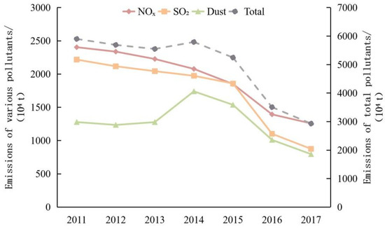 From 2011 to 2017, China’s air pollutant emissions generally showed a decreasing trend. NOx and SO2 decreased year by year, and dust showed an increasing and then decreasing trend. Annual average emissions of NOx, SO2, and dust decreased by 11.45 Mt (−47.64%), 13.42 Mt (−60.53%), and 4.82 Mt (−39.05%), respectively.