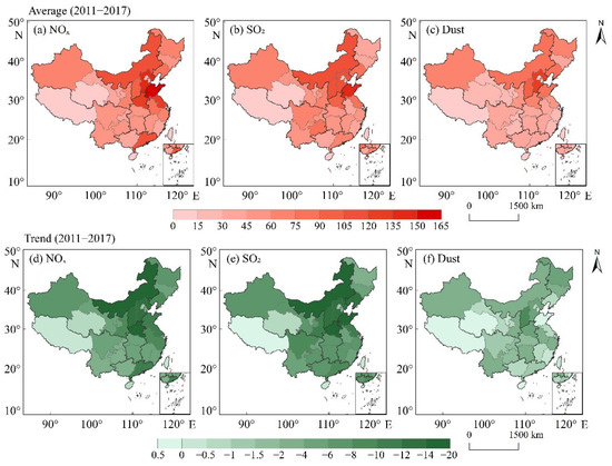 Spatial distribution of the (a,b,c) emissions of three air pollutants (NOx, SO2, and dust) in China (2011–2017) and (d,e,f) trend values for provincial units.