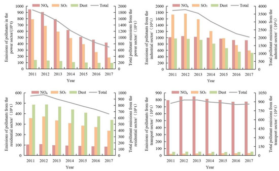 The composition of the main pollutants emitted by sectors is different, and there are various emission reduction measures for sectors in APAPPC. Pollutant emissions in the power, industrial, residential, and transportation sectors showed a decreasing trend from 2011 to 2017 (Figure 4), with relative changes of −62.93, −45.18, −30.17, and −1.42%, respectively. The most significant reduction was observed in the power sector and the least significant reduction in the transportation sector. Specifically, NOx emissions showed the largest reduction in the power sector (−55.89%; Table 1). SO2 emissions from the power and industrial sectors showed notable reductions (−76.89 and −65.55%, respectively); however, emissions from the transportation sector increased by 32.12%. Dust emissions showed the greatest reduction in the industrial sector (−46.42%) but increased in the transportation sector (4.06%).