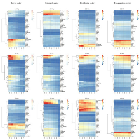 The temporal variations in pollutant emissions by sector for each province and region are shown in Figure 5. Cluster analysis showed that pollutant emissions could be divided into two periods: 2011–2013 and 2014–2017.