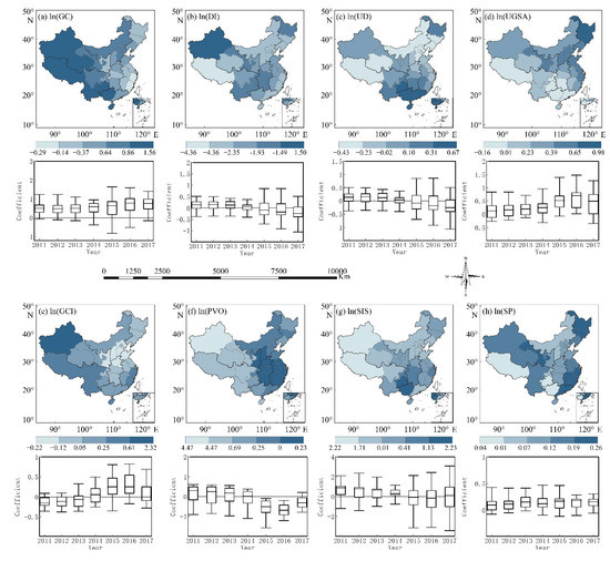 Based on the coefficients of each variable for the three pollutants (Table 4), the variables had different effects on each. The signs of the respective coefficients also varied over time, highlighting the spatial and temporal heterogeneity exhibited by the variables. Among them, electricity generation had a significant positive effect on pollutant emissions, whereas disposable income had an inhibitory effect.