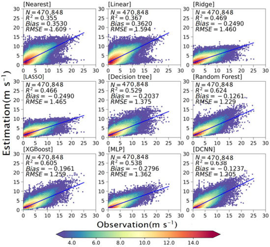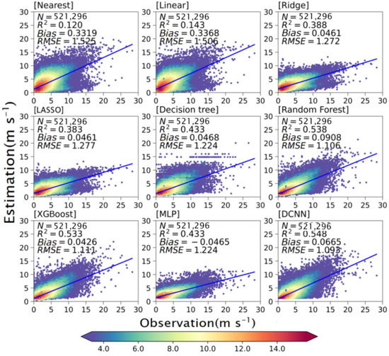 Scatter plots of wind speeds estimated by all nine grid-to-site conversion models and observed values for the summer test dataset. The value of colorbar is represented .