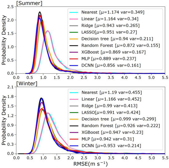 To further characterize the distribution of RMSE, Figure 3 shows the probability density distributions (PDFs) of the RMSE of WS10 in summer and winter for different models. In general, the means of the PDFs for both winter and summer are shifted to smaller values with smaller spreads for the ML methods in comparison with those for the conventional interpolation methods. For example, the mean RMSE for conventional interpolation is around 1.2 m s−1, whereas the mean RMSEs for RM and DT are 0.9–1.0 m s−1, and the XGBoost, RF, and DCNN models show even smaller values. The error distribution of these three models is also more concentrated.