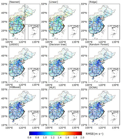 Spatial distribution of RMSEs of summer wind speeds across eastern China estimated by different interpolation methods.