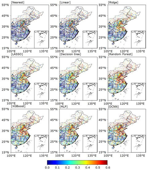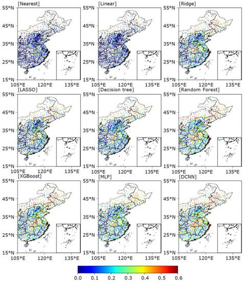 Figure 12 shows the distribution of the estimated RMSE with respect to the mean wind speed. In areas where the mean WS10 is between 0 and 2.5 m s−1, the RMs, TMs, ML, and DL models perform similarly, much better than the LMs. In regions with mean WS10 greater than 2.5 m s−1, the RMSEs of both RMs and the MLP are close to those of the LMs, indicating that these models lose applicability to these areas. However, DCNN, XGBoost, and RF maintain their good estimation performance. The results for winter are similar to those for summer in areas with WS10 ≤ 2.5 m s−1. However, for areas with WS10 > 2.5 m s−1, the RMs, MLP, and DT provide poor estimations, even worse than the two LMs. While XGBoost and RF perform better than those models, they are close to the two LMs in areas with 5.5–6.0 m s−1 mean WS10. Finally, the DCNN performs well in winter, with a significant advantage over the other eight models.