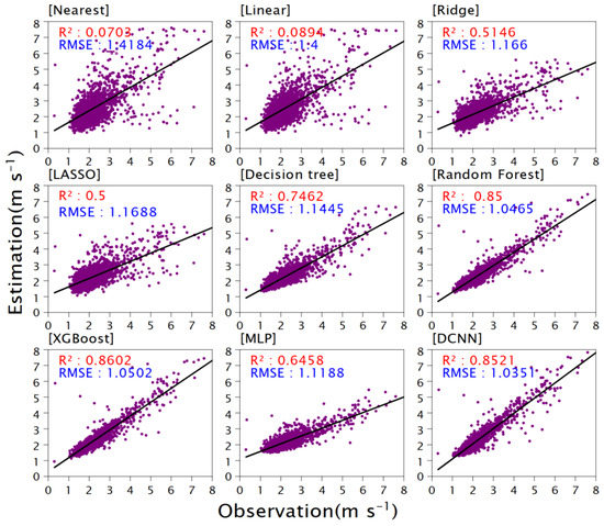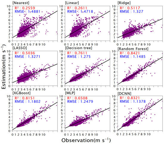 To evaluate the accuracy of the estimated spatial distribution of WS10, Figure 8 and Figure 9 show scatter plots of observations and estimations for the time-averaged WS10 at each site in summer and winter. For the summer, the RMs and TMs show RMSEs that are about 17% and 18% lower than those of the LMs; that of the DCNN, the best model, is 26% lower. Each ML and DL model shows a significantly larger R2 value than the LMs and RMs: those of the LMs are all below 0.09, and those of the RMs are around 0.5. The R2 values of the RF, XGBoost, and DCNN are 0.85, 0.86, and 0.85, respectively, which indicates that these ML and DL models can appropriately handle the spatial distribution of WS10.