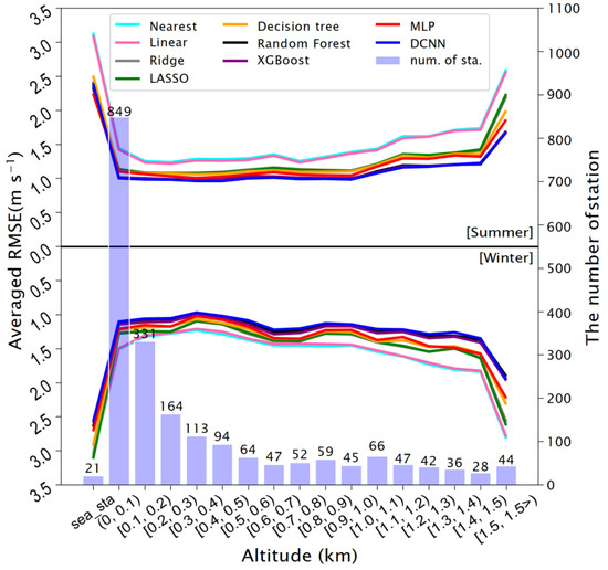 Figure 10 shows the averaged RMSEs for WS10 in summer and winter for the altitude bins. The error in estimating WS10 at zero elevation is the largest for both winter and summer. This may be related to the large errors in WS10 values at sea level in the ERA5 datasets [59,60]. For summer, all models have the smallest RMSEs for sites at 200–300 m. For the sites with altitudes over 200 m, the RMSEs essentially increase with increasing height. For the RMs, TMs, and DL models, the RMSEs do not vary significantly for the 0–500 m bins, as they all introduce the altitude as an estimation factor, but their RMSEs increase with altitude for sites above 500 m. In contrast, the DCNN performs best for all altitude bins and does not show significantly varying error with altitude. The results for winter are similar to those in summer.